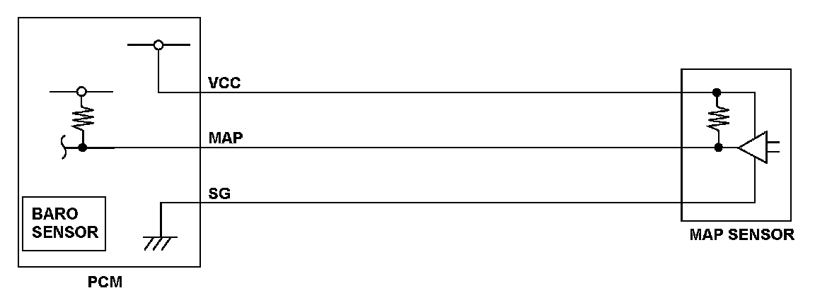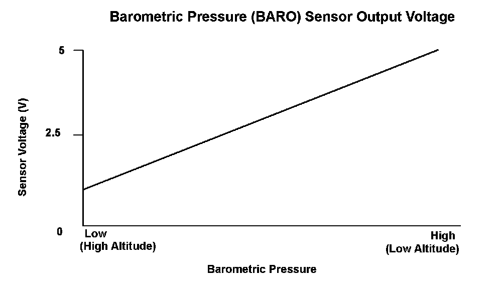 The barometric pressure (BARO) sensor is built into the powertrain control module (PCM), and it monitors atmospheric pressure. The PCM estimates appropriate intake airflow from the manifold absolute pressure (MAP) sensor output voltage and BARO sensor output voltage. If the BARO sensor output voltage is a specified value, the PCM detects a malfunction and stores a DTC.