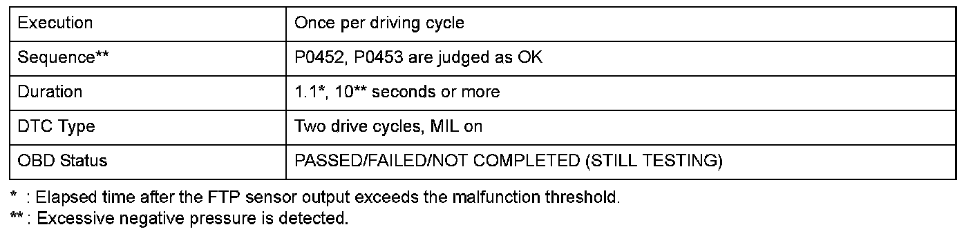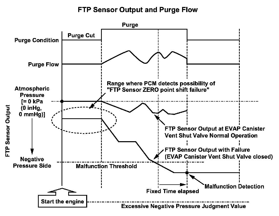 The fuel tank pressure (FTP) sensor output is near atmospheric pressure (0 kPa (0 inHg, 0 mmHg)) before purge starts since the evaporative emission (EVAP) canister vent shut valve is normally open (to the atmosphere). The sensor indicates a negative pressure value (vacuum) while purging. When the FTP sensor indicates vacuum after the engine starts, a FTP sensor zero point shift failure or an EVAP canister vent shut valve stuck closed can occur. To prevent these failures, the powertrain control module (PCM) monitors the FTP sensor output after purge starts. The PCM detects a malfunction of the EVAP canister vent shut valve if the output indicates excessive vacuum. However, if the fuel tank internal pressure is below the specified value (excessive vacuum is detected) when starting the engine, the malfunction detection should be done as follows because it is difficult to distinguish between FTP sensor range problem (P1454) and an EVAP canister vent shut valve stuck closed problem (P2422).