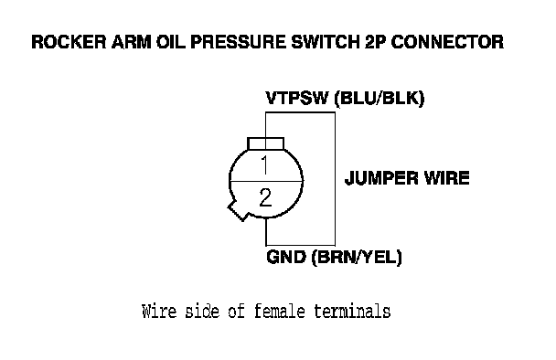 7. Connect rocker arm oil pressure switch 2P connector terminals No. 1 and No. 2 with a jumper wire.
