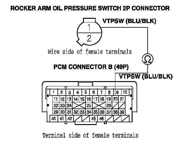 14. Check for continuity between PCM connector terminal B20 and rocker arm oil pressure switch 2P connector terminal No. 1.