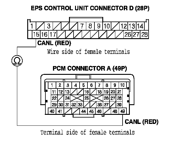 11. Check for continuity between PCM connector terminal A49 and EPS control unit connector D (28P) terminal No. 15.