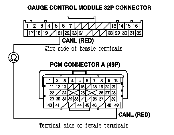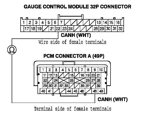 11. Check for continuity between PCM connector terminal A49 and gauge control module 32P connector terminal No. 21.