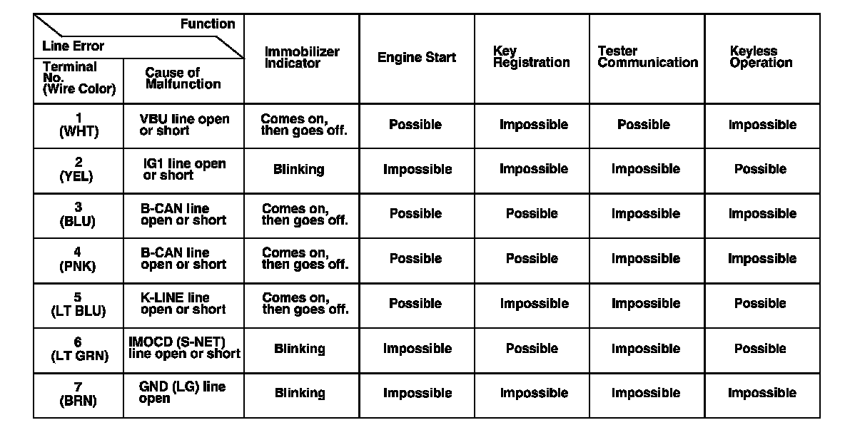 If a malfunction occurs in the immobilizer circuit, use the table to cross-reference the malfunction criteria to the line(s) that should be checked in the table:
