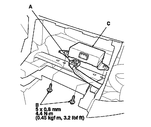 2. Disconnect the connector (A), then remove the mounting bolts (B) and the ANC/active sound control unit (C).