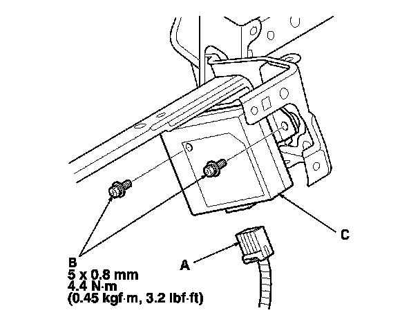 2. Disconnect the connector (A), then remove the mounting bolts (B) and the ANC/active sound control unit (C).