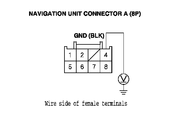8. Measure the voltage between navigation unit connector A (8P) terminal No. 4 and body ground.