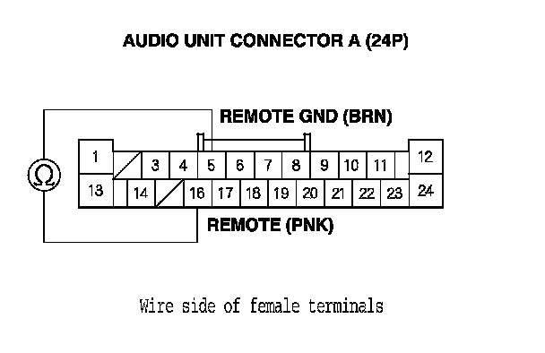 7. Reconnect the audio remote switch, and measure the resistance between audio unit connector A (24P) terminals No. 5 and No. 16 as specified in the table.