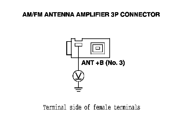 11. Measure the voltage between AM/FM antenna amplifier 3P connector terminal No. 3 and body ground.
