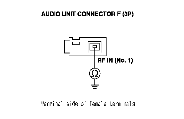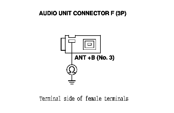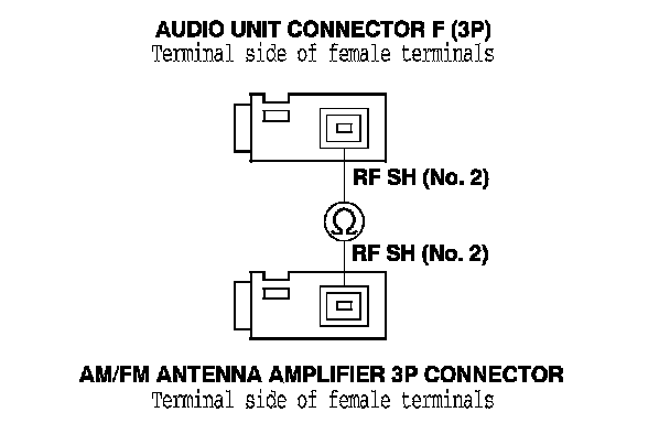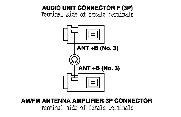15. Check for continuity between audio unit connector F (3P) terminal No. 3 and AM/FM antenna amplifier 3P connector terminal No. 3.