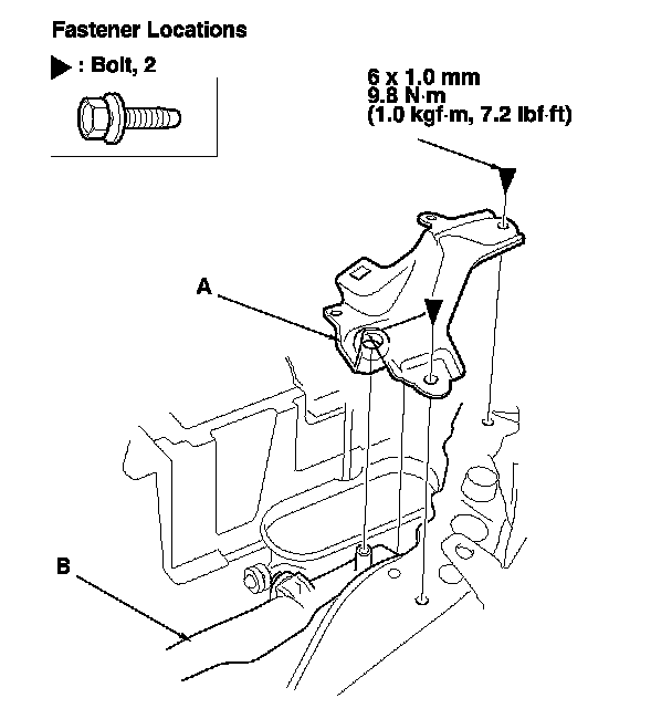 2. Remove the bolts, and pull up the left radiator upper bracket (A), to release it from the radiator (B), then remove the bracket.