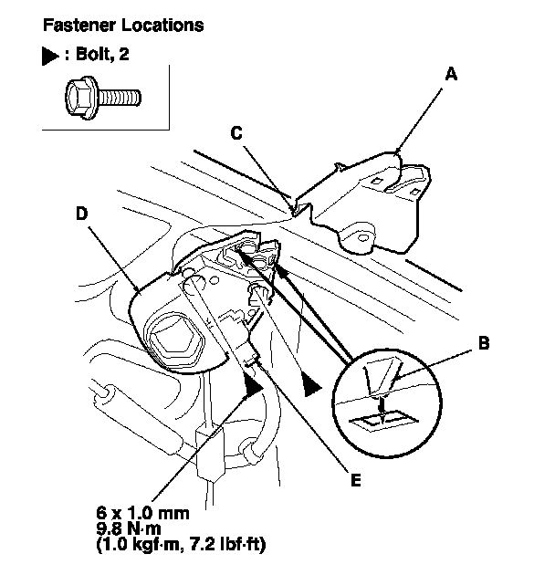 3. Disconnect the trunk lid latch connector (E), and remove the bolts, then remove the latch.