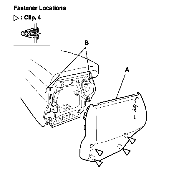 1. Gently pull out the center console rear trim (A) to detach the clips and to release both upper tabs (B) on the console, then remove the trim.