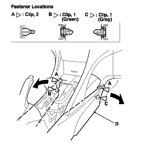 2. Detach the clips (A, B, C) by pulling out the front edges of the center console (D), then release both front areas of the console from the dashboard as needed.