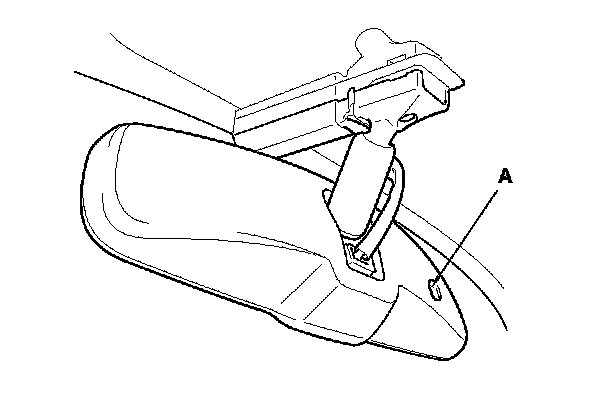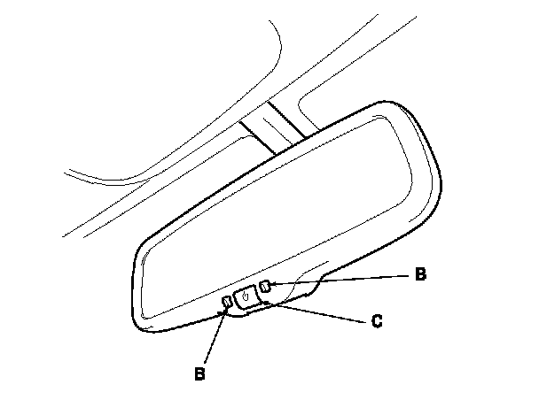 The automatic dimming inside mirror has a front-facing lux level sensor (A), rear-facing lux level sensors (B), and a control unit. The control unit receives signals from each sensor. Based on the difference between the two lux levels (the light outside the vehicle and the light from the headlights of the other vehicle, etc.), the control unit controls the electro-chromic gel to reduce glare. This dimming function is canceled when the transmission is in reverse, or when the automatic dimming off button (C) is turned OFF.