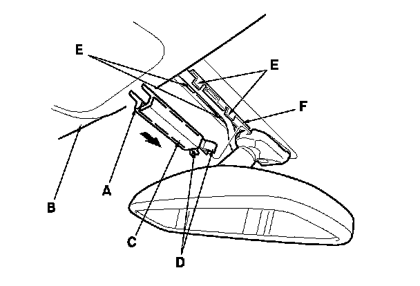 1. Slide the rearview mirror harness upper cover (A) forward to release it from the headliner (B). Pry out the rearview mirror harness lower cover (C) to release the hooks (D), then slide the lower cover rearward, and remove the lower cover by releasing the hooks (E) on the rearview mirror harness cover base (F).