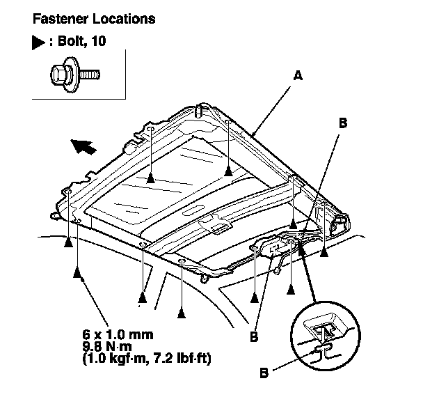 4. With an assistant holding the frame (A), remove the bolts, starting at the rear, and release the rear hooks (B) by moving the frame forward.