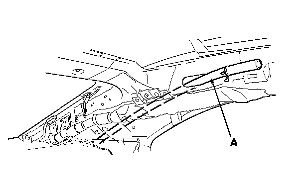 9. Remove the rear drain tube (A) from the tube clip (B). Remove the rear drain valve (C) from the body, and tie a string to the top end of the drain tube, then pull the drain tube down out of the C-pillar. Leave the string in the pillar to use when reinstalling the drain tube.