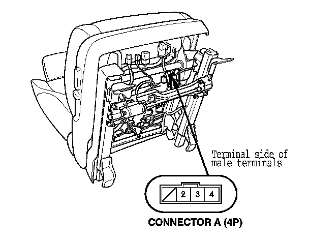 8. Check for continuity between seat heater connector A (4P) terminals No. 2 and No. 3, and terminals No. 3 and No. 4. There should be continuity.