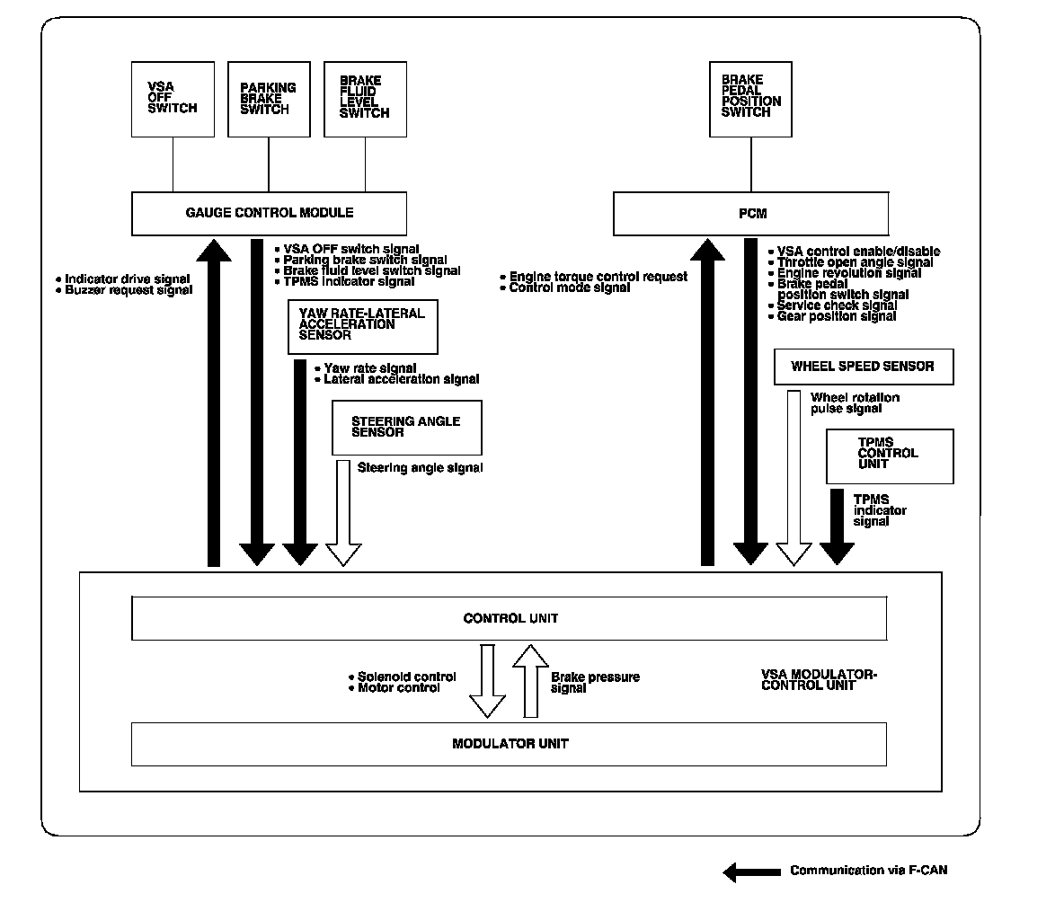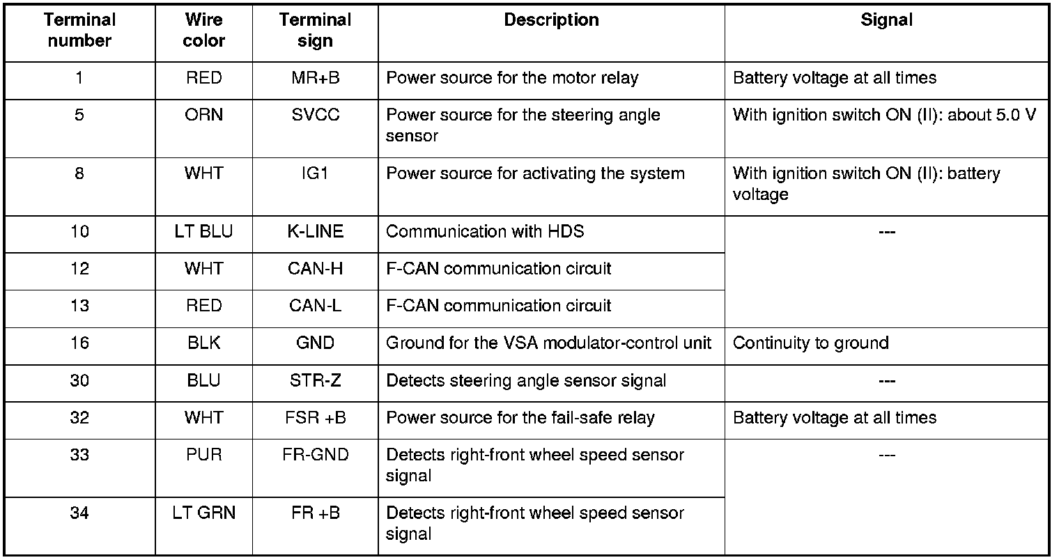 This system is composed of the VSA modulator-control unit, the wheel speed sensors, the steering angle sensor, the yaw rate-lateral acceleration sensor, and the system indicators in the gauge control module. The VSA modulator-control unit controls the ABS, EBD, TCS, VSA, and brake assist with the brake pressure of each wheel and reduces engine torque.