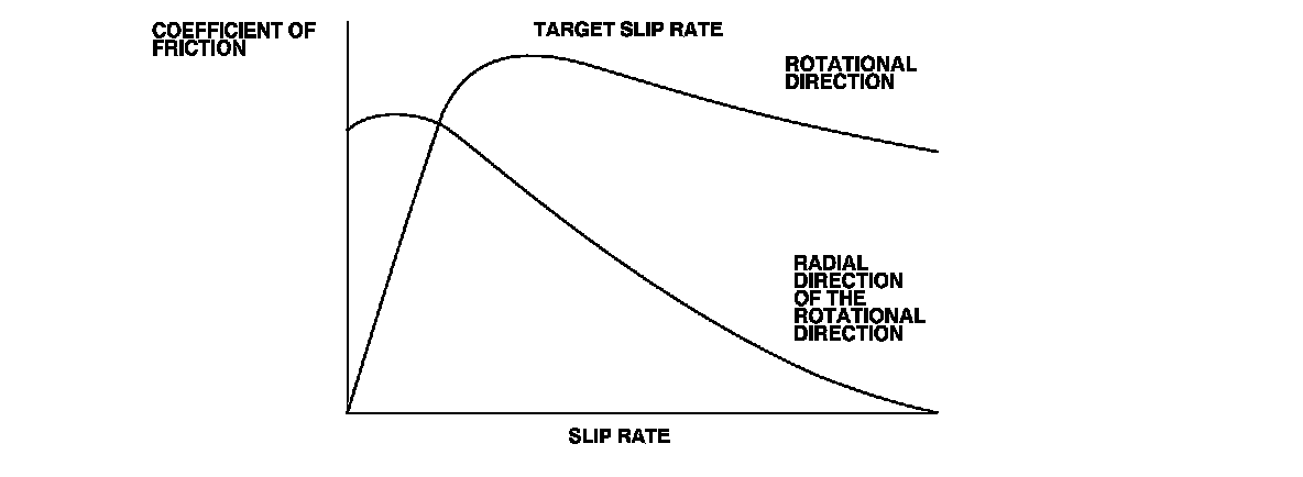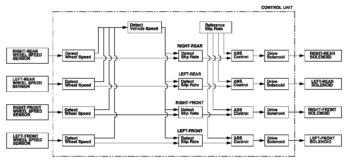 Without ABS, when the brake pedal is pressed while driving, the wheels sometimes lock before the vehicle comes to a stop. In such an event, the maneuverability of the vehicle is reduced if the front wheels are locked, and the stability of the vehicle is reduced if the rear wheels are locked, creating an extremely unstable condition. With ABS, the system precisely controls the slip rate of the wheels to ensure maximum grip force from the tires, and it thereby ensures maneuverability and stability of the vehicle. The ABS calculates the slip rate of the wheels based on the four wheel speeds, and then it controls the brake fluid pressure to reach the target slip rate.