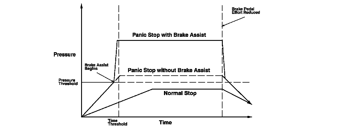 Brake assist helps ensure that any driver can achieve the full braking potential of the vehicle by increasing brake system pressure in a panic situation, bringing the vehicle into a full ABS stop.