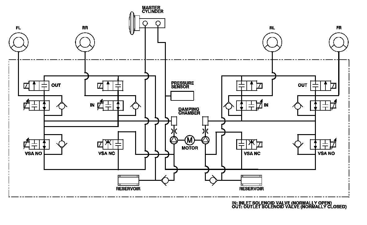 The hydraulic circuit is an independent four channel type; one channel for each wheel.