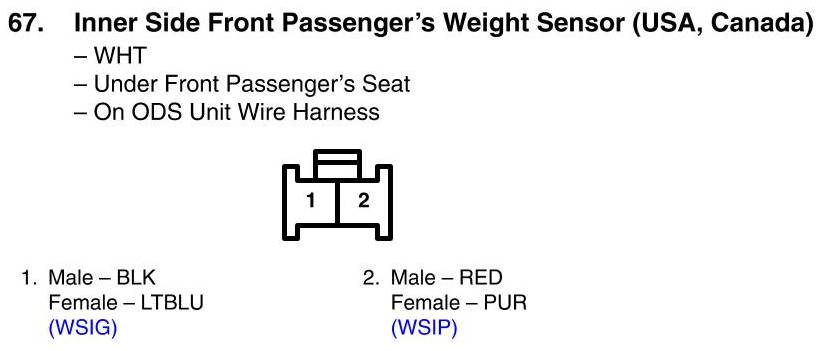 View 67 - Inner Side Front Passenger's Weight Sensor Connector View (USA, Canada)