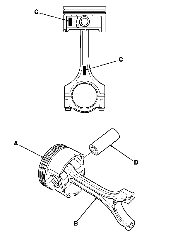 4. Assemble the piston (A) and the connecting rod (B) with the embossed marks (C) on the same side. Install the piston pin (D).
