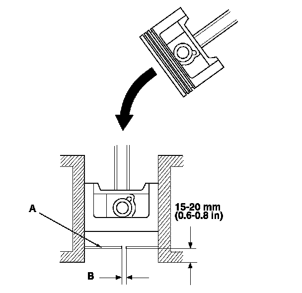 4. Using a piston, push a new ring (A) into the cylinder bore 15-20 mm (0.6-0.8 in) from the bottom.