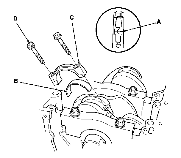 9. Apply new engine oil to the bolt threads and flanges, then loosely install the bearing cap bolts (D) and the bearing cap side bolts (E).