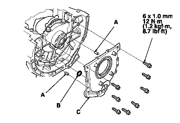 29. Install the dowel pins (A), a new O-ring (B), and the engine block end cover (C) on the engine block.