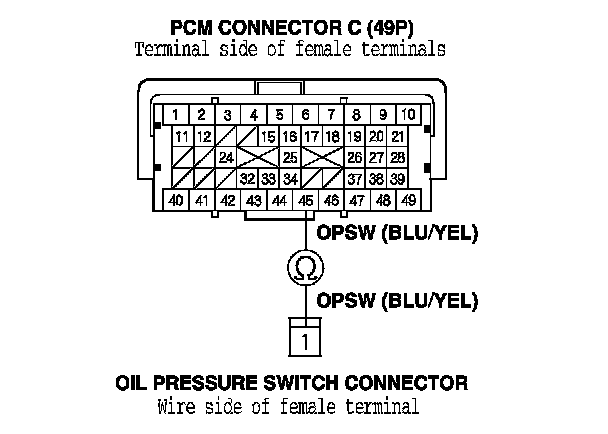 10. Check for continuity between PCM connector terminal C45 and the oil pressure switch connector.