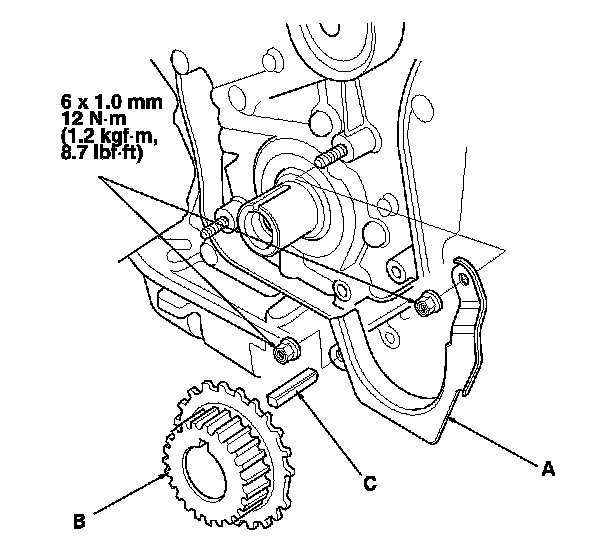 2. Remove the timing belt stopper (A), then remove the timing belt drive pulley (B) and the key (C).
