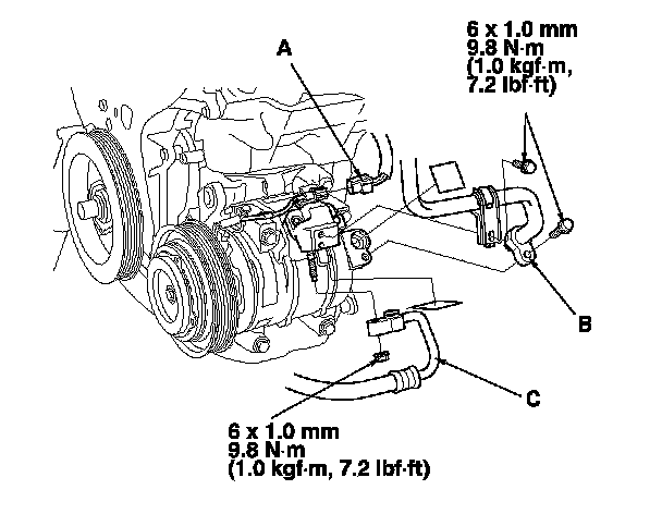 4. Disconnect the A/C compressor clutch connector (A). Remove the bolts and the nut, then disconnect the suction hose (B) and the discharge hose (C) from the A/C compressor. Plug or cap the lines immediately after disconnecting them to avoid moisture and dust contamination.
