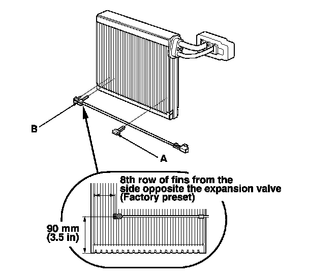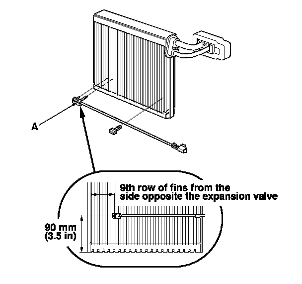 8. When the evaporator temperature sensor (A) is reinstalled onto a new evaporator core, set the evaporator temperature sensor in the 8th row of fins from the side opposite of the expansion valve.