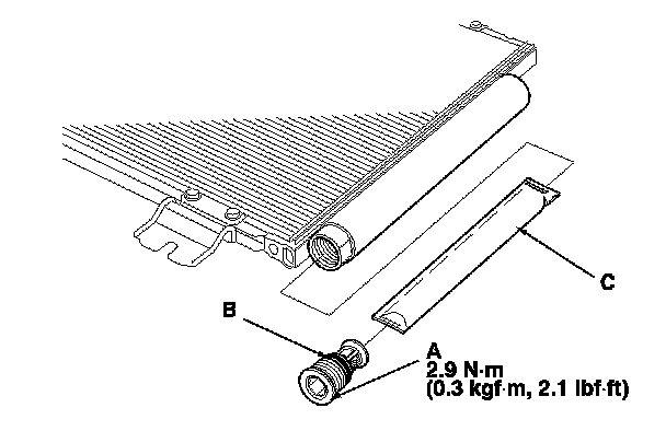 2. Remove the cap (A) from the bottom of the A/C condenser. Remove the O-ring (B) and the desiccant (C).