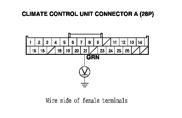 8. Measure the voltage between climate control unit connector A (28P) terminal No. 21 and body ground.