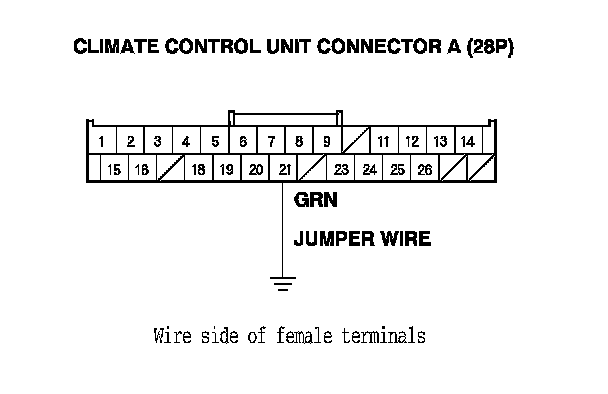 9. Connect climate control unit connector A (28P) terminal No. 21 to body ground with a jumper wire.