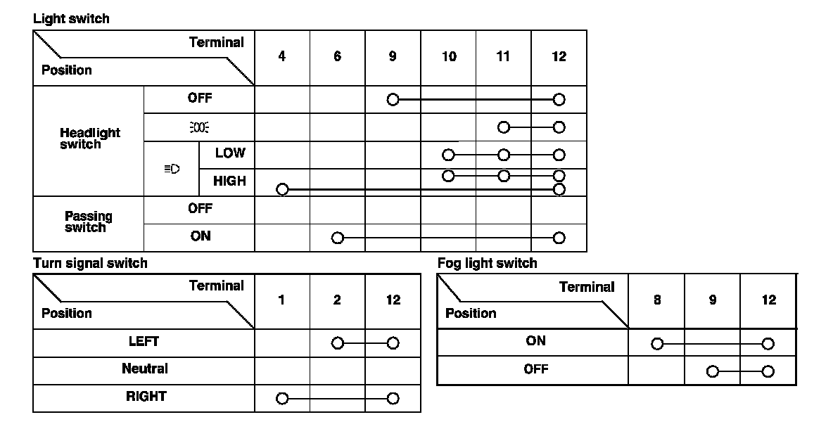 - If the terminals look OK, check for continuity between the terminals in each switch position according to the tables.