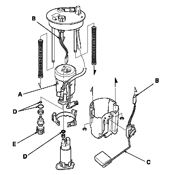 4. Install the parts in the reverse order of removal with new O-rings (D) and a new bracket (E). When installing the fuel tank unit, align the marks on the unit and the fuel tank. Fuel Tank Unit Removal/Installation