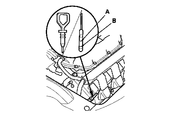 3. Remove the dipstick, and check the engine oil level. It should be between the upper mark (A) and lower mark (B).