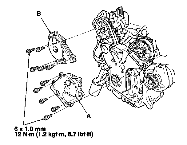 2. Set the timing belt drive pulley to top dead center (TDC) by aligning the TDC mark (A) on the tooth of the timing belt drive pulley with the pointer (B) on the oil pump.