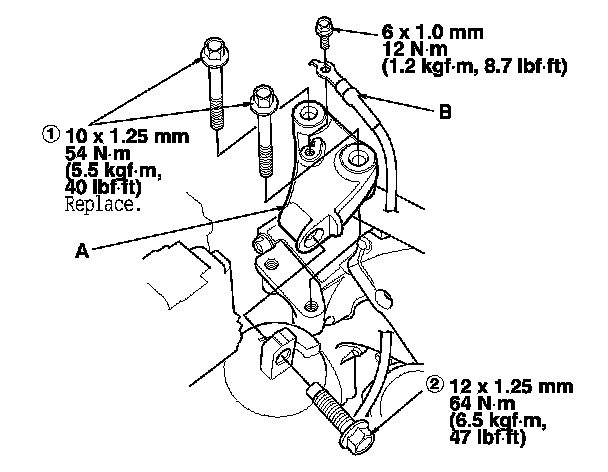 17. Install the upper half of the side engine mount bracket (A), then tighten the mounting bolts in the numbered sequence shown.