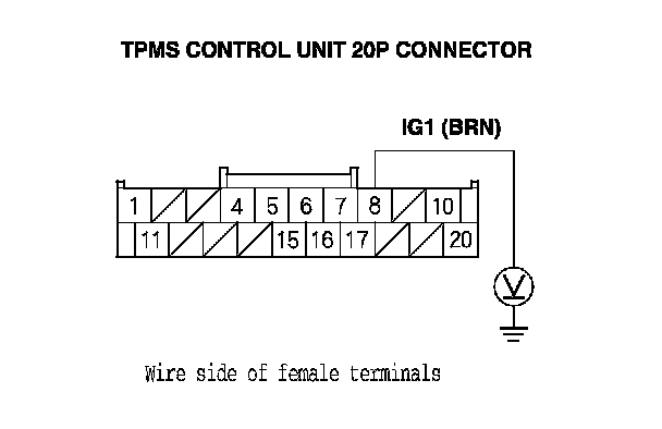 14. Measure the voltage between body ground and TPMS control unit 20P connector terminal No. 8.