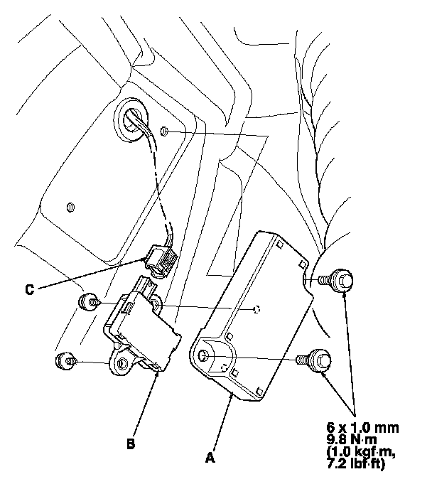 4. Remove the cover (A) with the initiator (B), and disconnect the initiator connector (C).