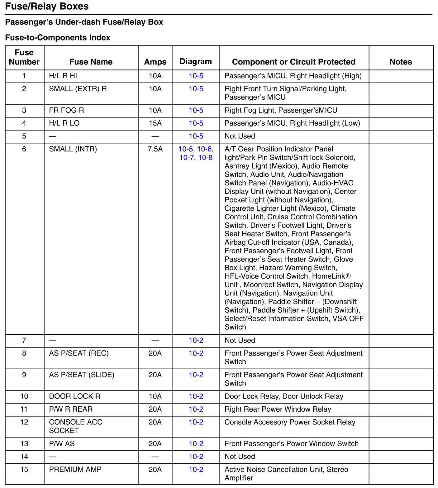 Passenger's Under-Dash Fuse/Relay Box - Fuse-to-Components Index