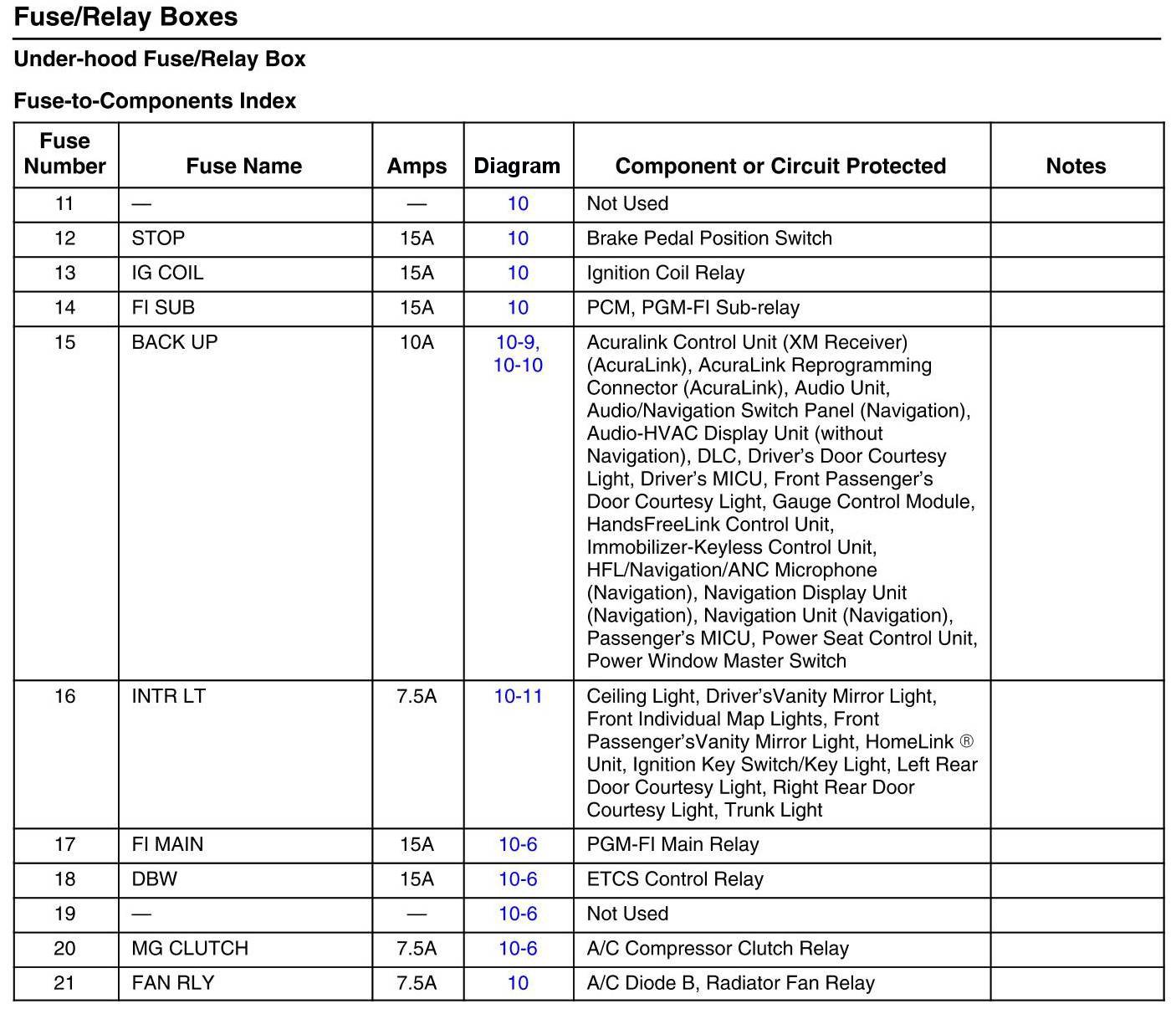 Under-Hood Fuse/Relay Box - Fuse-to-Components Index