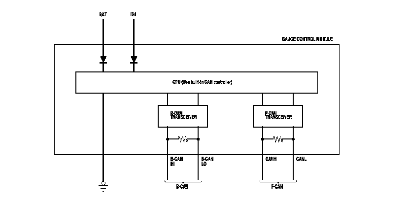 The body controller area network (B-CAN) and the fast controller area network (F-CAN) share information between multiple electronic control units (ECUs). B-CAN communication moves at a slower speed (125 kbps) for convenience related items and for other functions. F-CAN information moves at a faster speed (500 kbps) for "real time" functions such as fuel and emissions data. To allow both systems to share information, the gauge control module translates and relays the information from B-CAN to F-CAN and from F-CAN to B-CAN. This is called the Gateway Function.