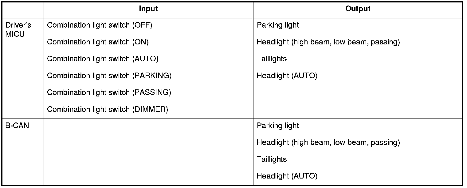 The driver's MICU control of the lighting system and horns is based on inputs from each switch and B-CAN.