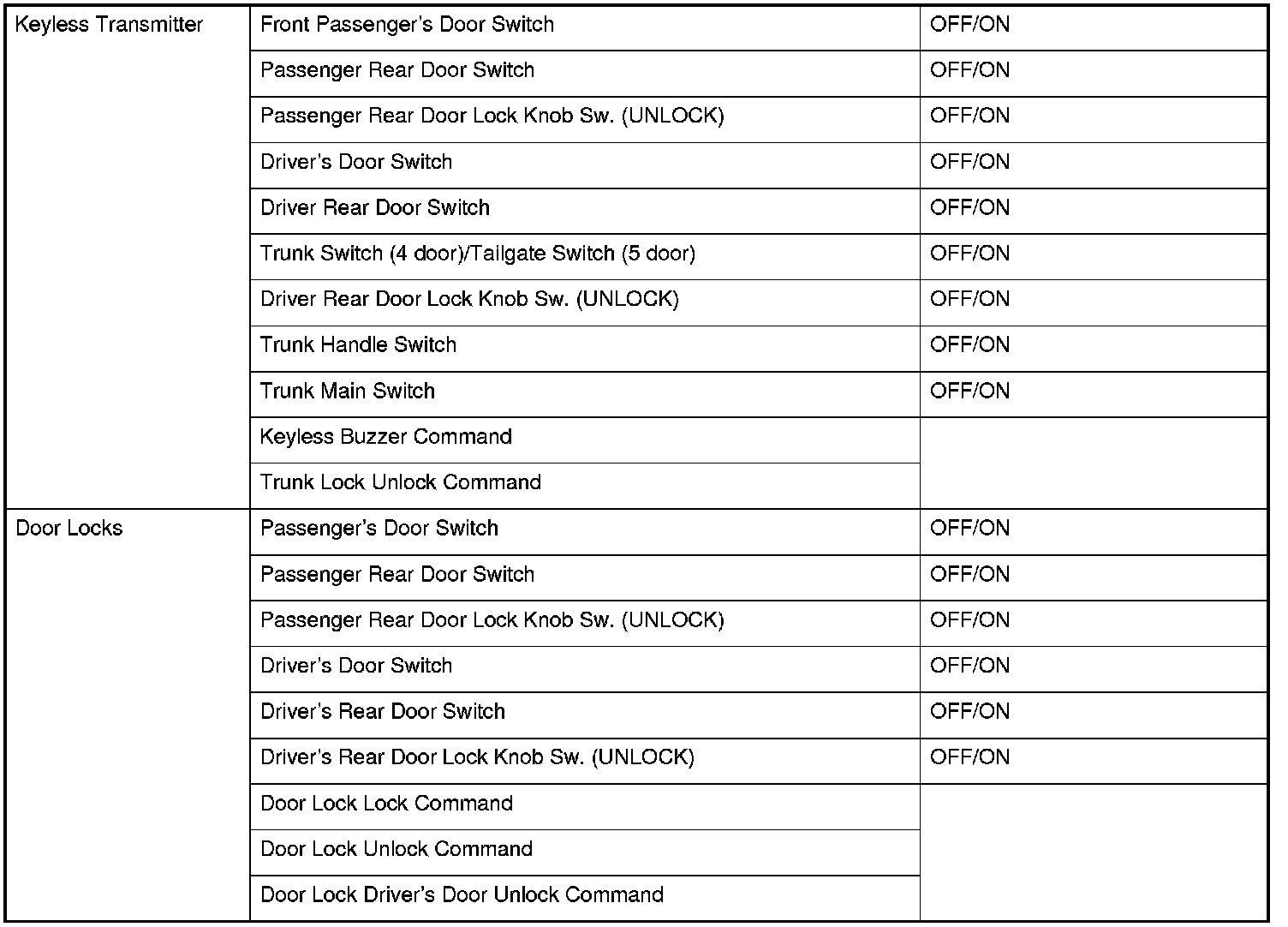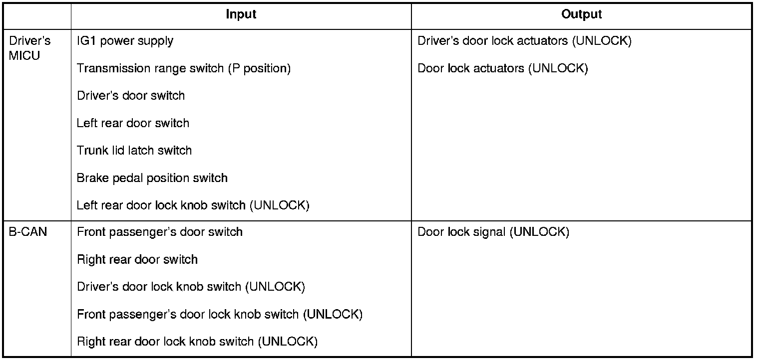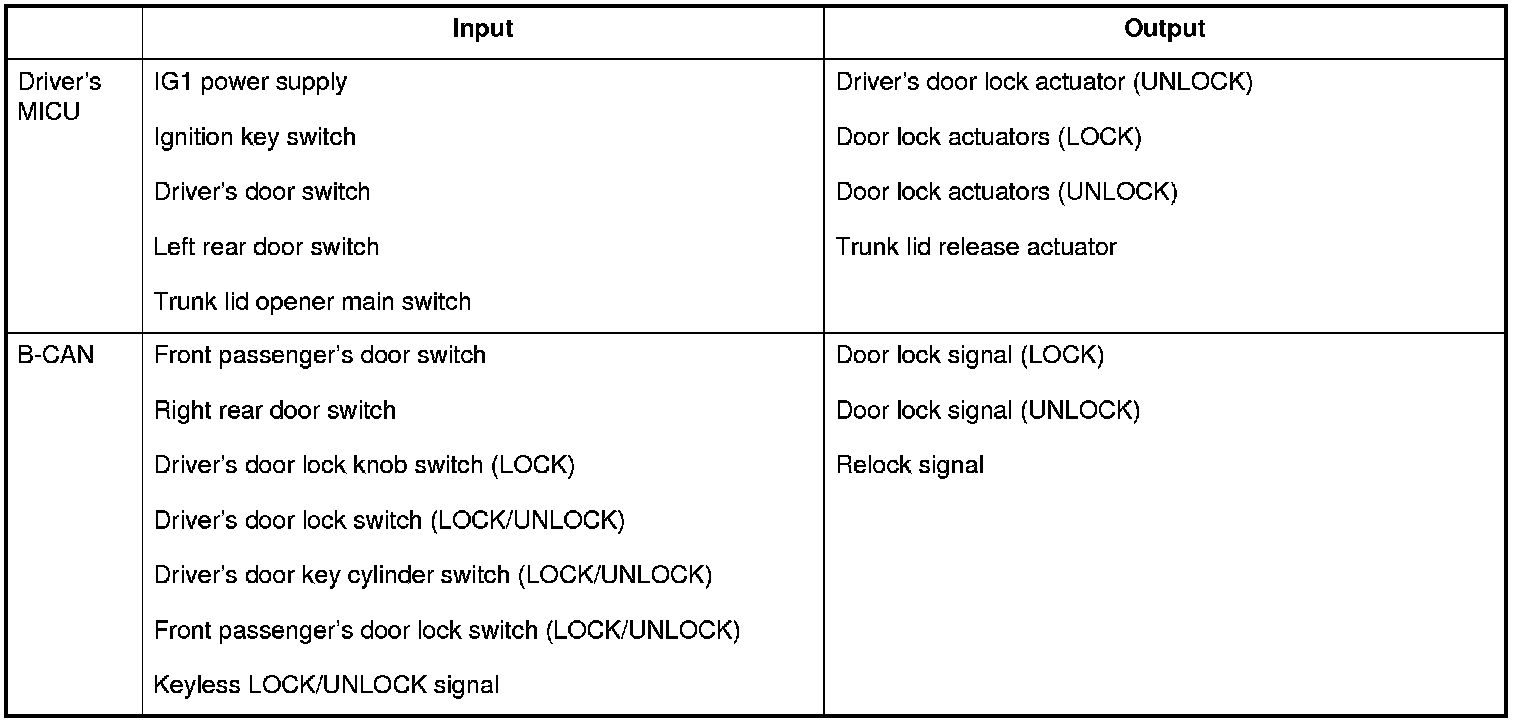 The driver's MICU control of the door lock actuators LOCK, UNLOCK, DRIVER'S UNLOCK, TRUNK UNLOCK is based on B-CAN door lock switch signals.